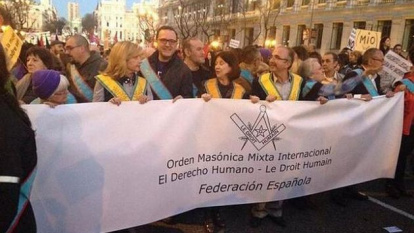 “Entendemos que esta ley recorta los derechos de las mujeres y por ello estamos aquí, para reivindicarlos”, explicó Ana Valet, presidenta de la Federación Española de la Orden Masónica Mixta e Internacional del Derecho Humano, cuya Federación del Derecho Humano mostraba una pancarta con su denominación y sus símbolos –el compás y la escuadra–, que marchaba en un lugar destacado de la manifestación.
