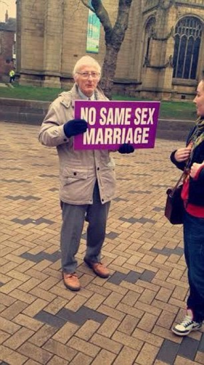 Con ocasión de la celebración de los primeros matrimonios gays en Inglaterra, Barkley se había presentado solo delante de la catedral de su ciudad, Wakefield, con dos carteles.