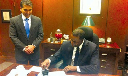 Alex Wan, de pie, sonríe mientras el alcalde Kasim Reed firma su apoyo al matrimonio homosexual.