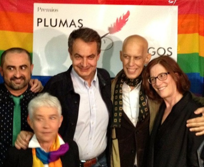 Pedro Zerolo, notablemente deteriorado por el tratamiento contra el cáncer que sufría, junto a José Luis Rodríguez Zapatero cuando recibió el 24 de abril de 2014 el Premio Pluma de parte del colectivo gay. "El día que se aprobó la ley del matrimonio homosexual tendríamos que haber puesto la bandera gay en La Moncloa", dijo Zapatero ese día. En el Orgullo Gay 2015, Jesús Posada (presidente del Congreso de los Diputados) y Cristina Cifuentes (presidente de la Comunidad de Madrid) hicieron realidad el sueño de Zapatero en las instituciones que presiden.