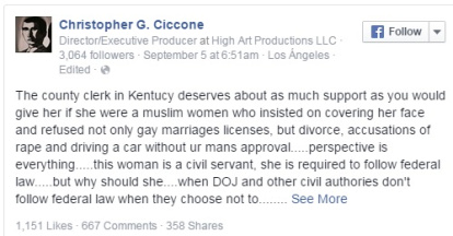 Según Ciccone, “la funcionaria de Kentucky merece todo el apoyo que uno le podría dar si fuera una mujer musulmana que insiste en cubrirse el rostro y que no solo negara licencias para matrimonios gay sino también divorcios”.