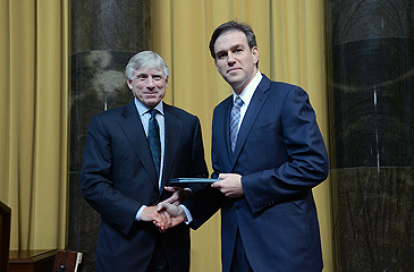 Bret Stephens (el más joven en la foto), recibiendo el 2013 el Premio Pulitzer de manos de Lee C. Bollinger, rector de la Columbia University.