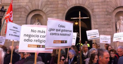 Cientos de manifestantes se dieron cita en la plaza sant Jaume de Barcelona para manifestar su repulsa a las ofensas a los sentimientos religiosos amparados por el ayuntamiento cuya regidora en Ada Colau.