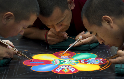 Construcción, destrucción y eliminación ritual de un mandala por parte del Dalai Lama, en el documental sobre el budismo tibetano Wheel of time [La rueda del tiempo], dirigido en 2003 por Werner Herzog.