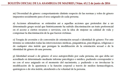 La normativa autonómica madrileña multaría con hasta 45.000 euros a quien ofrezca ayuda a alguien que quiera abandonar sus sentimientos homosexuales ("cualquier intervención médica, psiquiátrica, psicológica o religiosa que persiga modificar la identidad de género u orientación sexual de una persona").