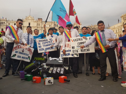 Una representación: activistas del lobby LGTB con traje y corbata han sobornado a los medios de comunicación, un sentir muy difundido por Perú