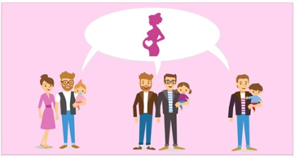 Dibujo publicitario de la industria de vientres de alquiler, todo "color de rosa"; la gestante es anónima, sin rostro; los clientes, sonrientes... se paga por el bebé y se saltan los controles de una adopción; también se impide el derecho del niño a un padre y una madre y a conocer sus raíces