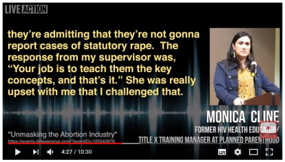 Lila Rose, fundadora de Live Action, compartió historias de sus propias imágenes en video, grabadas en forma encubierta en dos sedes de Planned Parenthood en Los Ángeles, donde se hizo pasar por una víctima de abuso menor de edad. En ninguno de los casos se informó el abuso a las autoridades policiales y, en cambio, se la alentó a mentir sobre su edad. Rose cree que Planned Parenthood usa el aborto como una herramienta para destruir la evidencia física. “El aborto es algo que luego se usa para permitir el abuso de niñas y encubrir”, explicó.