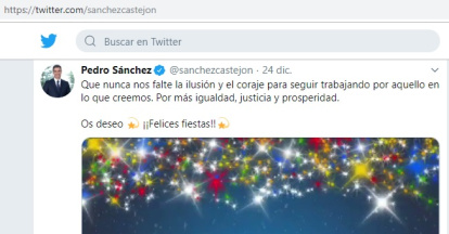 Por contraste, en España, donde el 70% de la población se declara católica, el presidente Pedro Sánchez, no se atreve ni a usar la palabra "Navidad" (y mucho menos felicitar a los cristianos) y su tuit del 24 de diciembre sólo declaraba: "¡Que nunca nos falte la ilusión y el coraje para seguir trabajando por aquello en lo que creemos. Por más igualdad, justicia y prosperidad. Os deseo ¡¡felices fiestas!!"