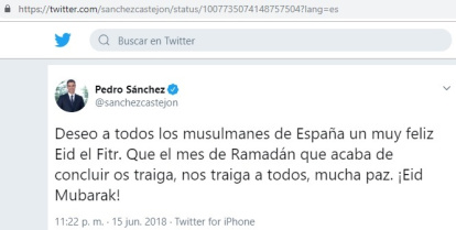 En cambio, cuando Pedro Sánchez felicita el final de Ramadán sí menciona la fiesta religiosa musulmana por su nombre y a la comunidad religiosa a la que se dirige: "Deseo a todos los musulmanes de España un muy feliz Eid el Fitr. Que el mes de Ramadán que acaba de concluir os traiga, nos traiga a todos, mucha paz. ¡Eid Mubarak!"