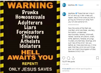 Las redes sociales de Israel Folau están llenos de mensajes de tipo religioso, no centrados en los temas LGTB sino que van mucho más allá como los que pide a los cristianos ser coherentes con su fe. De hecho, la publicación que propició su despido y persecución era una imagen en Instagram que decía: “Borrachos, homosexuales, adúlteros, mentirosos, fornicarios, ladrones, ateos, idólatras, el infierno os espera. Arrepentíos. Sólo Cristo salva”.