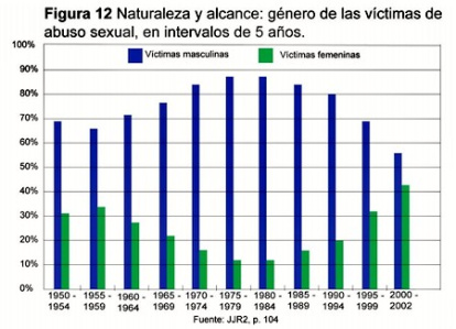 Porcentaje de víctimas masculinas y femeninas en los casos de abusos del clero estudiados en el informe del Ruth Institute, el más exhaustivo hasta la fecha.