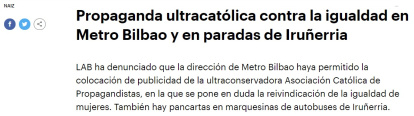El sindicato de izquierda nacionalista LAB en el País Vasco fue de los más escandalizados. Su filial en Metro Bilbao declaró que la campaña (un Avemaría que resalta la palabra mujer y madre) es un «ataque frontal a la igualdad de todas las personas», así como a la libertad de culto y la aconfesionalidad y exigió su retirada inmediata.