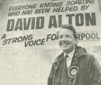 David Alton fue reelegido durante 18 años como miembro de la Cámara de los Comunes por dos distritos de Liverpool: 'Todo el mundo conoce a alguien a quien ha ayudado David Alton', reza el cartel, que le define como 'una potente voz por Liverpool'.