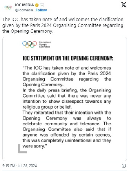 En su cuenta oficial de Twitter/X, IOC Media, el COI se dio por satisfecho con estas palabras. "EL COI toma nota y da la bienvenida a la clarificación para por el Comité Organizador París 2024 sobre la ceremonia de apertura". El COI lo llama "clarificación" y no disculpa ni petición de perdón.