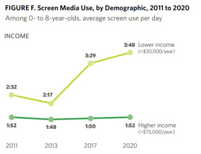 En los niños de hasta 8 años las diferencias en uso de pantallas según los ingresos familiares son también significativas: en 2020, 3:48 horas (ingresos inferiores a 30.000 dólares anuales) frente a 1:52 horas (ingresos superiores a 75.000 dólares anuales). Fuente: Common Sense Media, 2020, pág. 11.