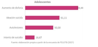 Según un estudio elaborado por la propia Federación Estatal de Lesbianas, Gais, Trans y Bisexuales, el 61% de los participantes afirmó haber tenido intenciones suicidas, el 50% se autolesionó y el 16% trató de llevar a cabo el suicidio.