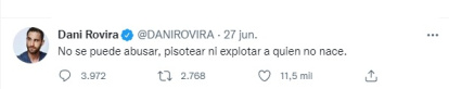 Dani Rovira, famoso por la comedia Ocho apellidos vascos, que se describe como "cómico, actor, improvisador, activista y animalista", ha "improvisado" el 27 de junio un tuit bastante absurdo para expresar su apoyo al aborto.