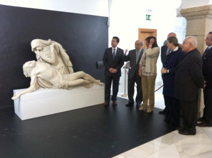 En la imagen el Presidente de la Fundación Juan de Ávalos, D. Juan Ávalos Carballo, junto al Presidente del Parlamento Extremeño D. Fernando Manzano y otras autoridades ante el primer boceto de la Piedad del Valle de los Caídos.