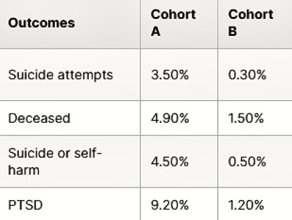 Comparativa de intento de suicidio, fallecimiento, suicidio/autolesión o estrés postraumático entre la cohorte A (1501 pacientes que llegan a urgencias y tienen historia clínica de cirugía de afirmación de género) y la cohorte B (15.608.363 de pacientes que llegan a urgencias sin esa historia clínica). Fuente: Straub et al, 2024, tabla 1 simplificada.