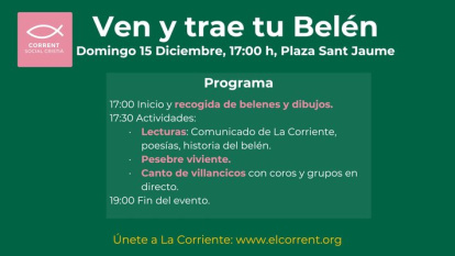 Por eso, Corriente Social Cristiana se está coordinando con otras asociaciones y grupos e invita a un gran encuentro navideño el 15 de diciembre en la Plaza Sant Jaume, con el título "Ven y trae tu Belén".