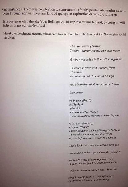 Treinta y ocho familias de Noruega, Polonia, Lituania, Eslovaquia, República Checa, Estados Unidos, Rumanía, Brasil, Filipinas, India, Turquía e Irak han firmado un escrito a inicios de diciembre dirigido a la Comisión Europea, al Parlamento europeo, al Papa Francisco y a las Naciones Unidas denunciando que el estado noruego ha secuestrado a sus hijos y los retiene en circunstancias de opacidad y al margen de la legislación internacional. El texto de denuncia se envía también a todos los europarlamentarios.