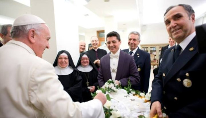 El Papa Francisco observa a uno de los corderos en Santa Marta