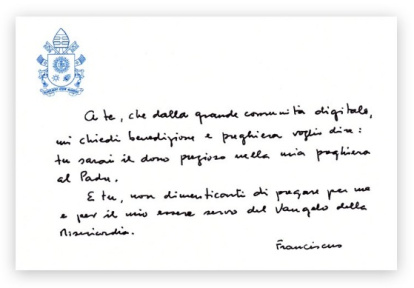 Por ello, el papa Francisco lanzó un mensaje firmado desde sus cuentas en las redes sociales Twitter (@pontifex_) e Instagram (@Franciscus): “A ti, que desde la gran comunidad digital me pides bendiciones y oración, quiero decirte ‘tú serás el don precioso en mi oración al Padre’ y no te olvides de rezar por mí para que sea siervo del Evangelio de la Misericordia”.