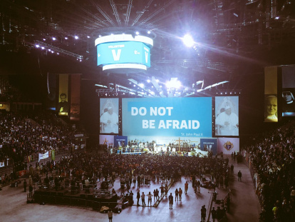 En el Tauron Arena, ante unos voluntarios entusiastas, el Papa dejó su discurso oficial en italiano ("es un poco aburrido", dijo) y se pasó a improvisar en español con la participación fervorosa de los muchos voluntarios hispanohablantes. De fondo, bien grande, la histórica frase de Juan Pablo II ("no tengan miedo") e imágenes de los santos patronos de la JMJ 2016.