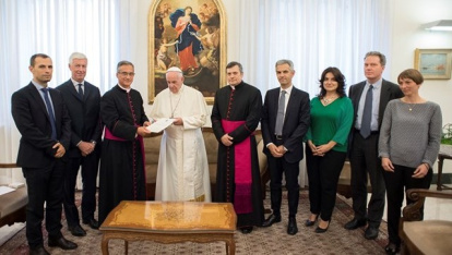 El equipo responsable de la nueva Secretaría de Comunicación del Vaticano, con el Papa Francisco y sus nuevos Estatutos