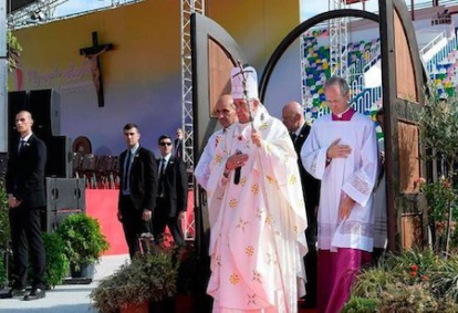 ...y la Puerta Santa sin iglesia que tuvo que cruzar Francisco en la misa en el estadio Meshki porque las autoridades han dificultado la construcción de un templo en el que habría debido ir incorporada.