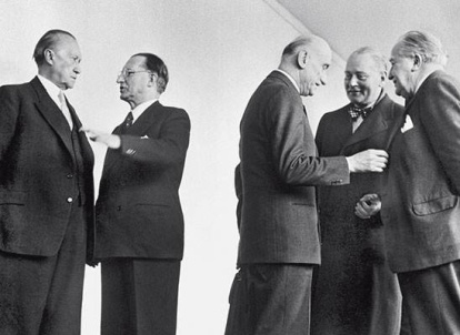 En el grupo de la izquierda, Konrad Adenauer y Alcide de Gasperi. Junto a ellos, el primero por la izquierda en el grupo de la derecha, Robert Schuman.