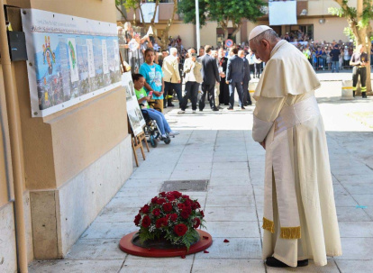 También en esta jornada, el Papa llegó a la Plaza Anita Garibaldi, donde Don Pino Puglisi fue asesinado, en Brancaccio, aclamado por una multitud festiva. Descendiendo del automóvil y se acercó a una niña con discapacidad que le regaló una almohadilla de rosas rojas. Francisco, después de haberla bendecido, se detuvo en oración delante del medallón de bronce, donde el sacerdote cayó después de haber sido asesinado a tiros por Giuseppe Grigoli, por encargo de la mafia.