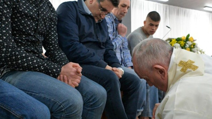 El Papa Francisco en el gesto de lavar los pies, propio del Jueves Santo, por quinta vez lo realiza en una prisión