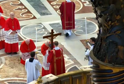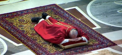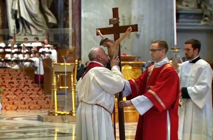 Francisco presidió este Viernes Santo la celebración de la Pasión del Señor en la basílica de San Pedro, un acto que comenzó con el siempre impresionante momento de ver al Papa postrado en oración ante el altar, en silencio. Seguidamente se proclamaron las lecturas y tres sacerdotes leyeron la Pasión según San Juan, a cuya finalización el padre Raniero Cantalamessa, predicador de la Casa Pontificia, predicó a los presentes sobre Cristo como "el despreciado y rechazado por los hombres". Los oficios concluyeron con las preces, la procesión y adoración de la Santa Cruz por el Papa, los cardenales y obispos presentes y otros fieles, y la comunión.