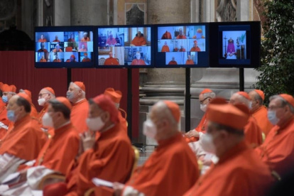 Debido a la pandemia, muchos cardenales no han podido viajar a Roma para este consistorio y lo han seguido a través de una conexión en directo / Vatican Media