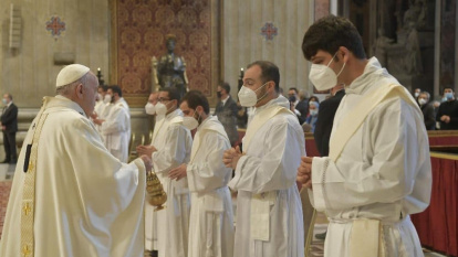 El Papa Francisco besa las manos de un nuevo sacerdote en el Domingo del Buen Pastor de 2021