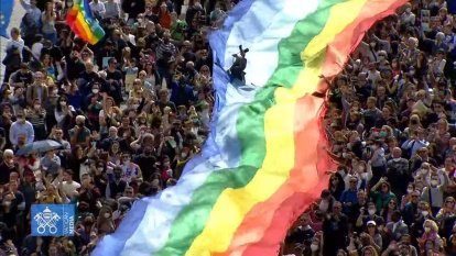 Francisco saludó a los organizadores de la marcha Perusa-Asís por la paz, que celebra su 60º aniversario, quienes agitaron su bandera arcoiris característica.