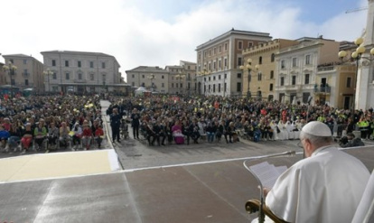 La presencia de Francisco en ese lugar y en esa fecha, en semanas en las que tanto se ha hablado de que podría hacer lo mismo que estos dos Papas, concedía especial interés informativo al viaje, que comenzó con una visita al Duomo (la catedral), donde recorrió las obras de reconstrucción tras el seísmo. Luego se dirigió a las autoridades locales y a las víctimas del terremoto, cuya dignidad ante la tragedia ensalzó.
