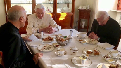 Benedicto XVI y su hermano Georg Ratzinger desayunan con Xuereb en 2017, cuando Benedicto ya estaba retirado como Papa emérito.