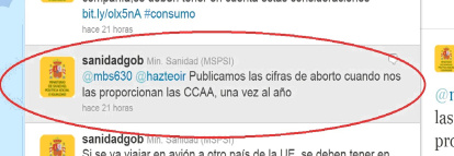 A través de la red social Twitter admitió un incumplimiento flagrante de la ley: "Publicamos las cifras de aborto cuando nos las proporcionan las comunidades autónomas, una vez al año".