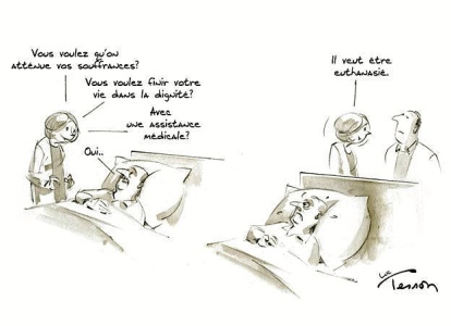 El blog católico francés Le Salon beige recoge este viernes un chiste del ilustrador Luc Tesson que refleja bien la manipulación del lenguaje ("derecho a una muerte digna" y demás) con la que los partidarios de la eutanasia intentan disfrazar la realidad de la eliminación de un ser humano incluso contra su voluntad, o con ésta engañada por eufemismos.