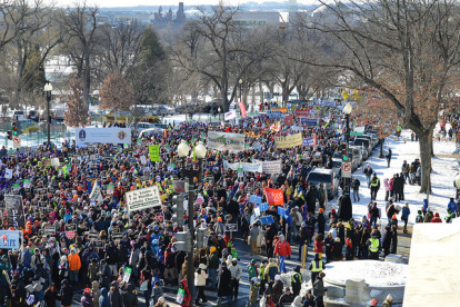 En años anteriores, la Marcha por la Vida oscilaba entre los 200.000 y los 400.000 participantes. Este año fueron menos. El temporal de nieve bloqueó carreteras y aeropuertos. No pudo llegar ningún autobús de los que organizaba la potente diócesis católica de Filadelfia, por ejemplo. Pero los miles que llegaron mostraron su entusiasmo habitual, impulsados por la juventud alegre de buena parte de los manifestantes.