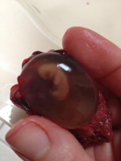 "Lo expulsé la tarde del Domingo de Ramos. El saco estaba intacto y todavía flotaba en el líquido amniótico. Hice una fotografía para no olvidar ese momento y cómo Dios escuchó mi súplica. Pienso que será una foto sorprendente para mostrar a quienes están considerando abortar. Aunque sólo tenía 7 semanas cuando murió, se puede ver formándose sus brazitos y piernecitas.