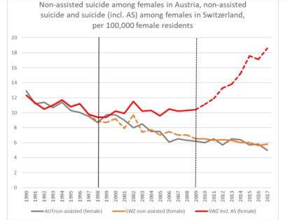 Este gráfico, parte del estudio, muestra el suicidio no asistido entre mujeres en Austria (AUT) por cada 100 000 mujeres residentes (en gris), junto con el suicidio no asistido (naranja) y el suicidio -incluido AS- (en rojo) entre mujeres en Suiza (SWZ) por cada 100 000 mujeres residentes, basados en datos de suicidio de la OCDE y datos de Dignitas.