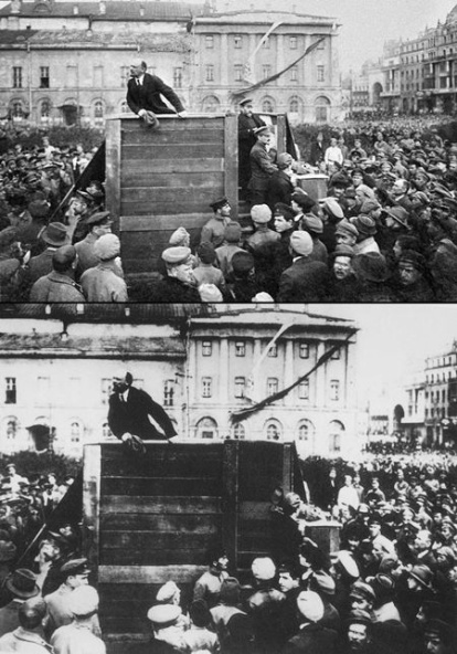 Lenin arenga a las tropas en la plaza Sverdlov de Moscú el 5 de mayo de 1920. Arriba, la foto original, donde se ve a Kamenev y a Trotsky a la derecha de la foto, en la escalera. En la foto oficial posterior a su caída en desgracia (abajo), ambos desaparecieron.