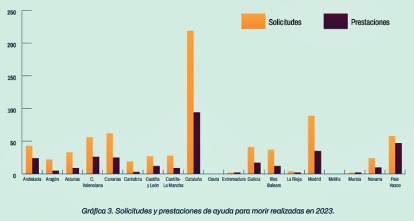 -En cuanto a la distribución regional, en términos absolutos y relativos se sitúa claramente en cabeza Cataluña, seguida de Madrid, el País Vasco, la Comunidad Valenciana y Canarias. En términos relativos a población, la diferencia entre el porcentaje sobre la población nacional y el porcentaje sobre el total de solicitudes de eutanasia se sitúan en un equilibrio (±4%), salvo en dos casos extremos, que son Cataluña por exceso (17% de población, 29% de solicitudes, un +12% de diferencia) y Andalucía por defecto (18% de población, 6% de solicitudes, un -12% de diferencia).