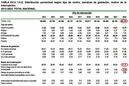 Al entrar en vigor en 2010 la ley de plazos, que permite abortar a demanda dentro de las 14 primeras semanas de embarazo (ley que en los pasados febrero -al derrotar el dictamen contrario- y mayo -al aprobar el dictamen favorable- fue declarada constitucional, para satisfacción del partido que la había recurrido), la alegación de motivos solo se registra a partir de ese periodo. El 91,23% de los 98.316 abortos de 2022 fue a petición de la madre y un 5,66% con alegación de grave riesgo para su salud, lo que supone el 64,53% de los abortos causales.