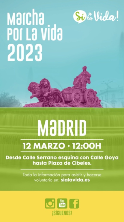 En Madrid la Marcha por la vida 2023 comenzará el 12 de marzo a las 12:00 horas en la Calle Serrano con Goya y concluye en la Plaza de Cibeles.