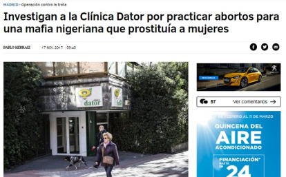Dos mujeres, una de ellas menor, fueron obligadas a abortar por los proxenetas después de quedarse embarazadas de clientes. La Policía Nacional ha liberado a tres víctimas que ejercían la prostitución en el polígono Marconi. La jefa de la organización era la hermana de dos de las víctimas. La Policía Nacional investiga a la conocida Clínica Dator de Madrid, especializada en practicar abortos, por prestar servicios a una mafia nigeriana. Las investigaciones, que llevan en curso desde principios de año, se centran en el papel de la clínica en dos abortos, uno de ellos a una menor de edad, realizados a dos mujeres que eran obligadas a prostituirse.